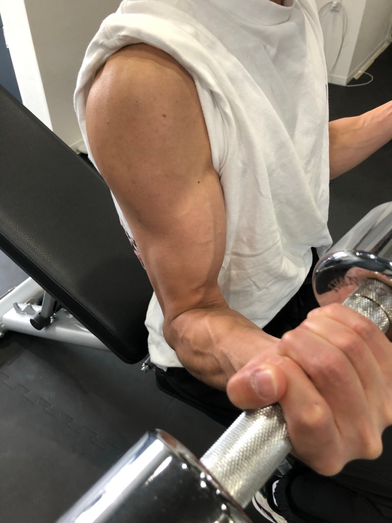 フォームを徹底して、ダンベルのみでの追い込み方も叩き込みながら。