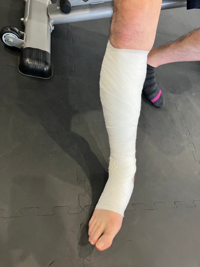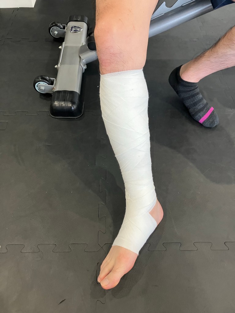 2日前の肉離れなので包帯で固定して、